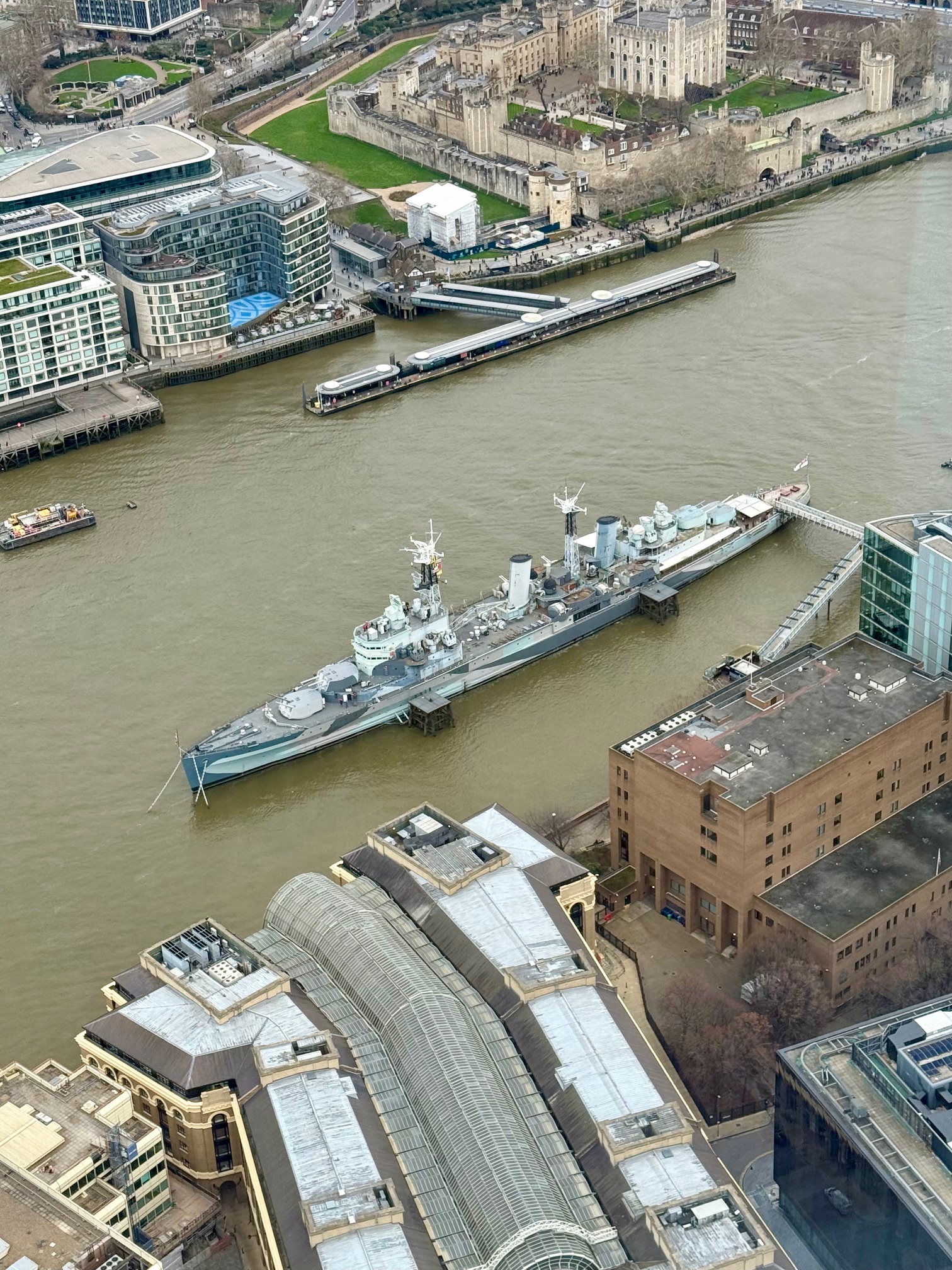As you walk from Tower Hill towards Tower Bridge, you’ll spot a warship anchored just behind the famous bridge: HMS Belfast. This ship took part in D-Day and is mainly remembered for its World War II history. It’s no longer in service but now functions as a museum where you can learn more about its past. It’s now part of the Imperial War Museum.